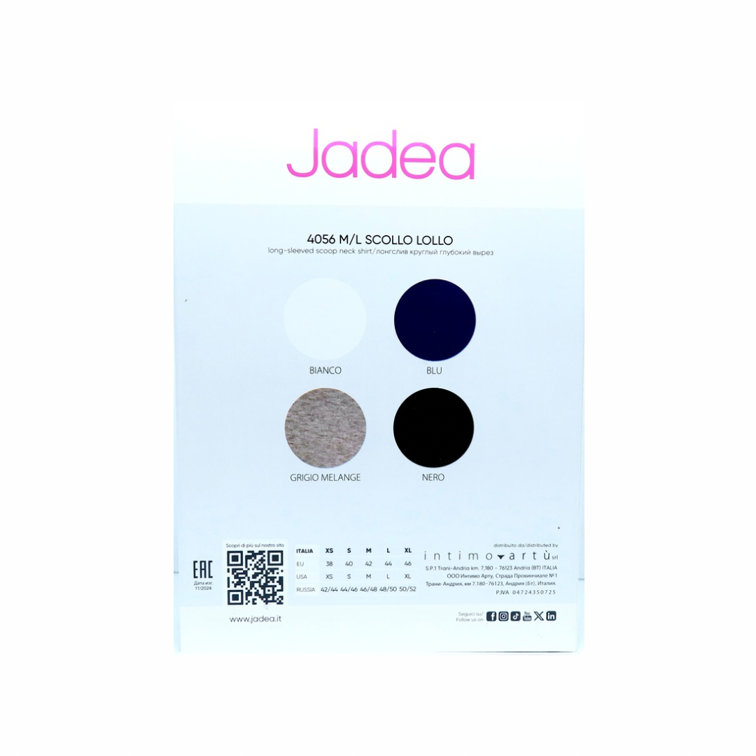 Maglia a manica lunga con scollo lollo Jadea Art. 4056, realizzata in cotone elasticizzato di alta qualità, pensata per avvolgere con delicatezza la figura e garantire comfort e vestibilità perfetta. Il profondo scollo “lollo” la rende una scelta elegante pur restando pratica come capo di base o sottogiacca.